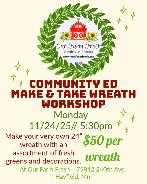 Join us here on the farm for a fun wreath making workshop. Monday November 24th at 5:30pm