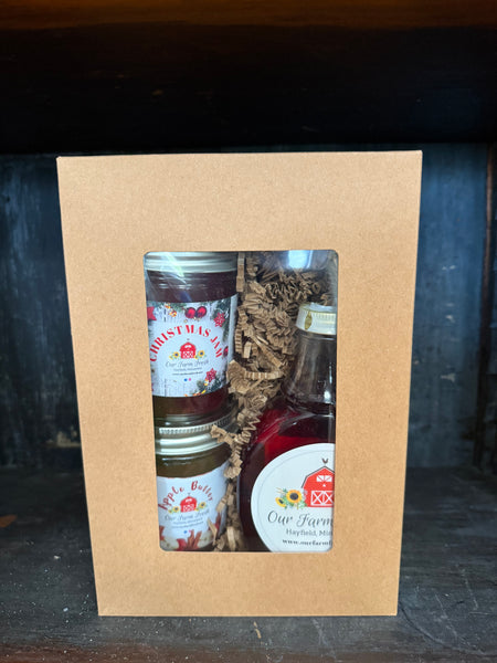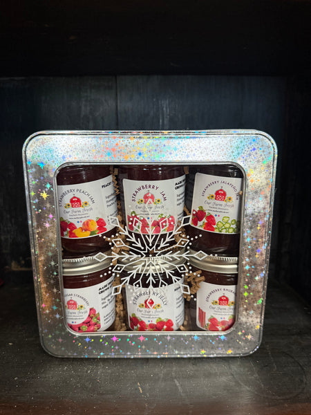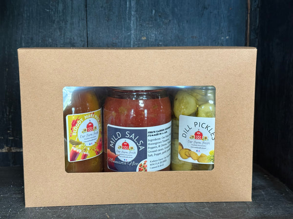Our homemade jams, salsas, pickles and syrups combined to make a great gift for anyone! Made from our homegrown strawberries, cucumbers, peppers, tomatoes, onions, dill, and elderberries. Other ingredients have been locally sourced. Jams & cowboy candy are 8oz. Pickles & salsa - 16oz. Strawberry syrup - 10oz. Elderberry syrup - 20oz